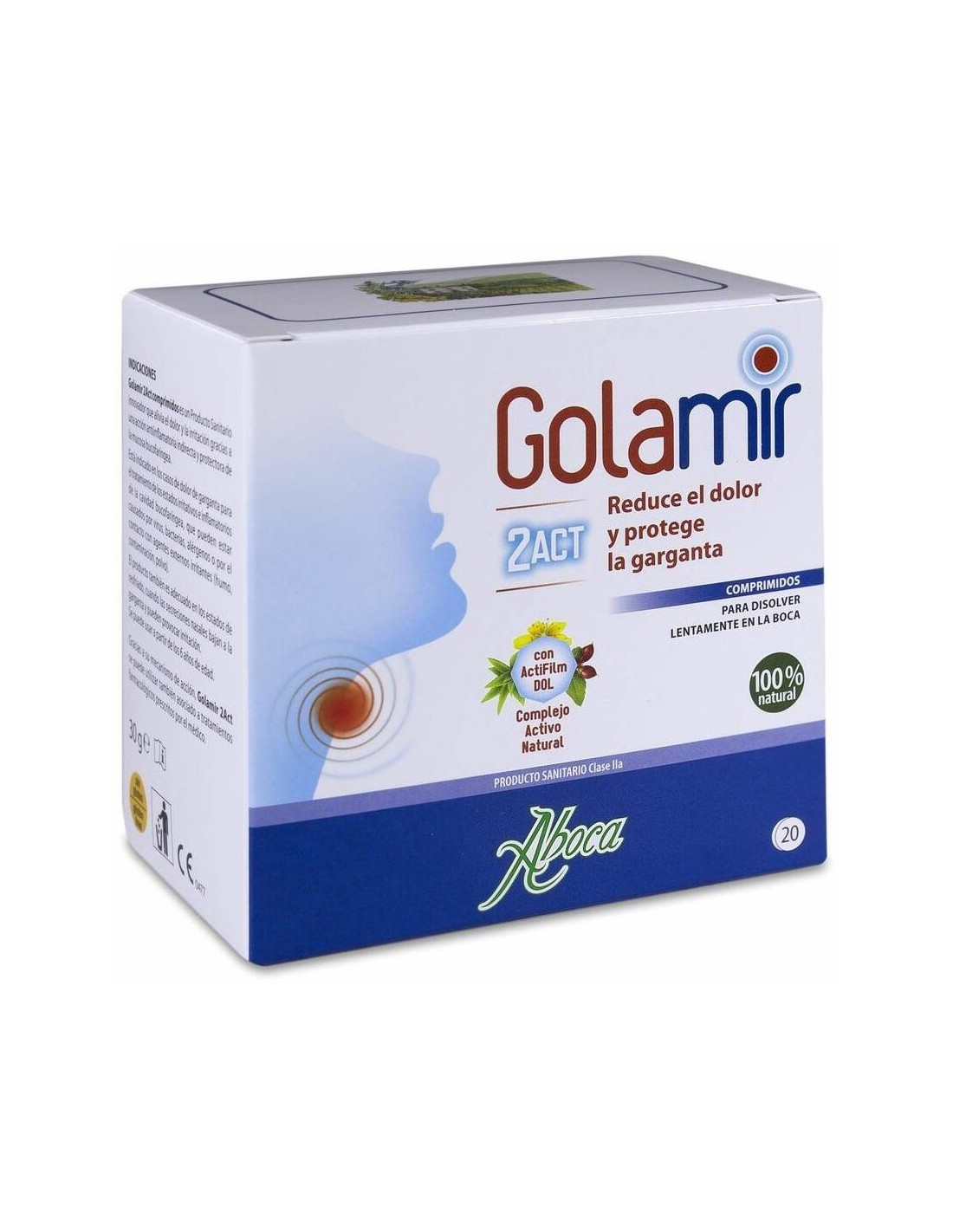 Aboca Golamir 2ACT 20comp es un complemento alimenticio 100% natural que ayuda a aliviar el dolor de garganta causado por agentes externos (virus, alergia, bacterias...), y a protegerla.