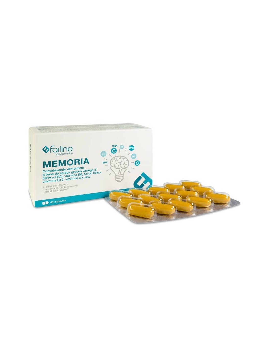 Complemento alimenticio en forma de cápsulas, elaborado a base de ácidos grasos omega 3, vitaminas D, B6 y B12, ácido fólico y zinc, que está especialmente indicado para ayudar el correcto mantenimiento del sistema cognitivo.