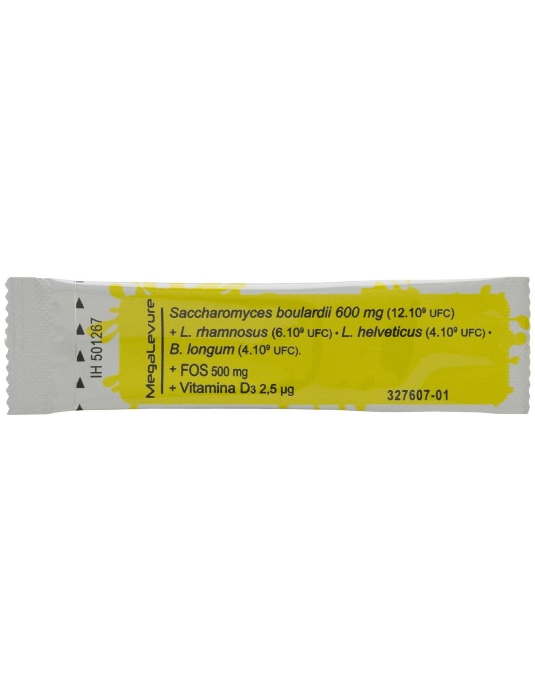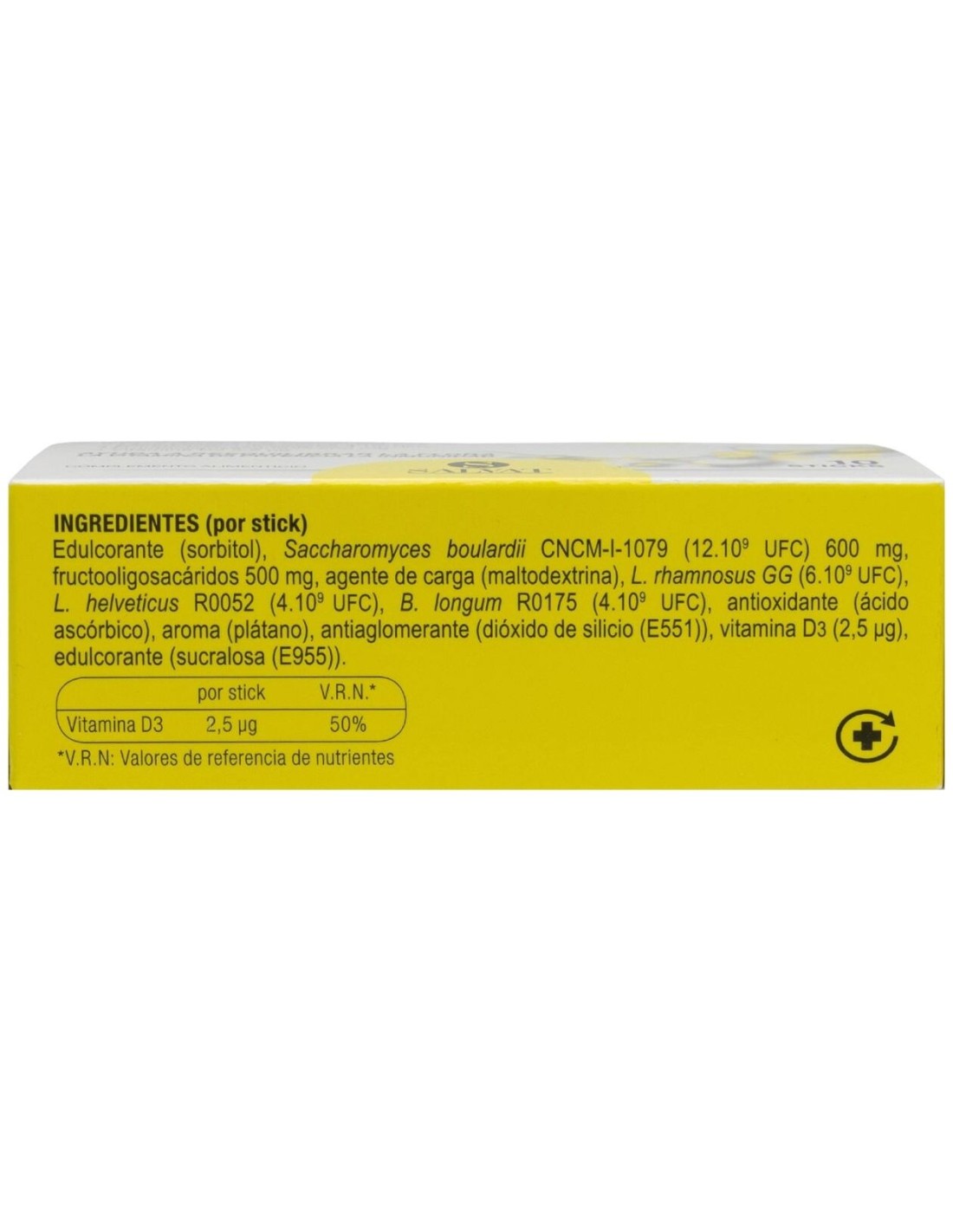 Edulcorante: sorbitol, Saccharomyces boulardii CNCM-I-1079 (12x10(9)) 600 mg, fructooligosacáridos 500 mg, agente de carga (maltodextrina), L. rhamnosus R0011 (6x10(9)), L. helveticus R0052 (4x10(9)), B. longum R0175 (4x10(9)), antioxidante (ácido ascórbico), aroma (plátano), antiaglomerante (dióxido de silicio (E551)), vitamina D3 (2,5 mcg), edulcorante: sucralosa (E955).Modo de empleo