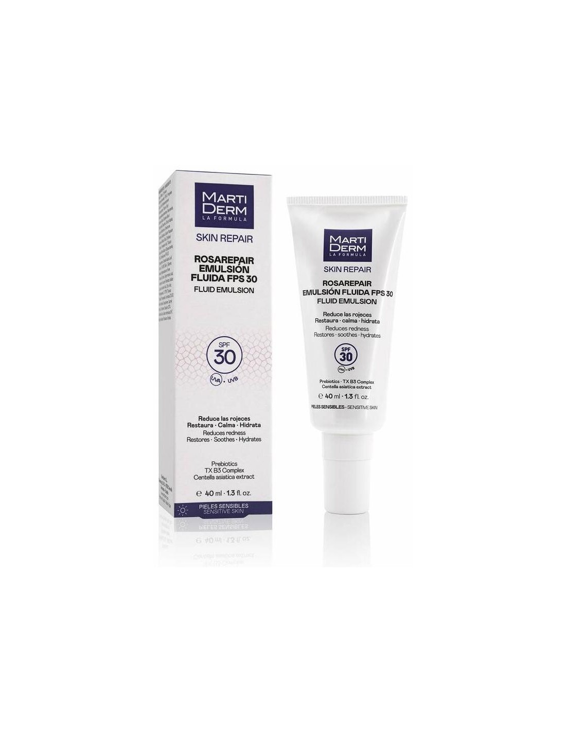 MartiDerm Rosarepair Emulsión Fluida SPF 30+ es un producto cosmético desarrollado por MartiDerm, específicamente, para personas con la piel más sensible. Su fórmula permite hidratar y calmar la piel de manera eficiente, restaurando la barrera protectora que protege las células de la epidermis de forma natural. Además, posee protección frente a la radiación solar, los rayos UVA y UVB. Su formulación se basa principalmente en sus dos activos principales: los prebióticos y el complejo TX B3 complex . Los prebióticos ayudan a proteger y equilibrar la microbiota cutánea de la piel para que se mantenga en un estado óptimo de salud y pueda proteger las células de agentes externos.