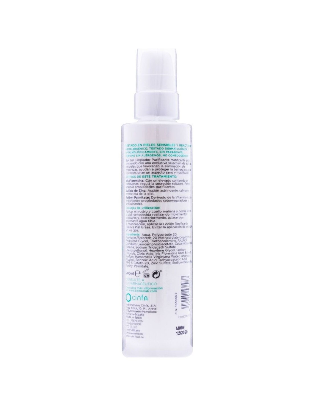 Composición de Be+ Gel Limpiador Purificante Matificante Piel Grasa, 200 ml