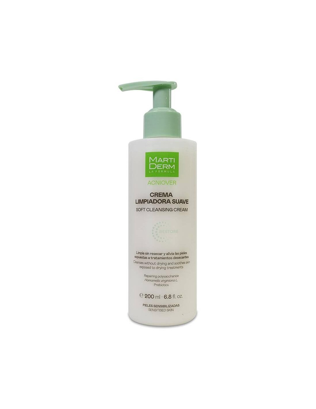 MartiDerm Acniover Restore Crema Limpiadora Suave tiene una textura cremosa y suave que le proporciona la manteca de karité incluida en la fórmula, que proporciona una limpieza suave, mientras que los prebióticos favorecen el equilibrio de la microbiota natural de la piel.